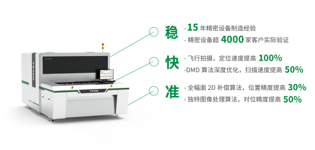 “天准TZDI系列激光直接成像设备”采用亚微米级精密驱控平台、全新一代DMD控制技术以及光学成像设计,融合天准视觉算法、融合标定、补偿算法等技术,以确保成像质量和对位精度天准TZDI系列激光直接成像设备拥有三大系列全自动连线产品,其中硬板双机双台面自动连线设备最高日产能≥10000片。